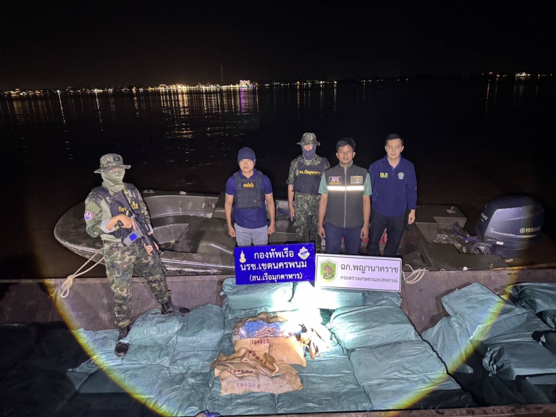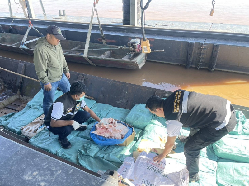 พันเอก รวิรักษ์ สัตตบุศย์ ผู้บังคับหน่วยเฉพาะกิจพญานาคราช เปิดเผยว่า เมื่อวันที่ 2 ตุลาคม 2568 ฉก.พญานาคราช นำโดยด่านกักกันสัตว์มุกดาหาร ร่วมกับ นรข.เขตนครพนม (สน.เรือมุกดาหาร) ด่านตรวจพืชมุกดาหาร ด่านตรวจประมงมุกดาหาร ด่านศุลกากรมุกดาหาร ทหารพราน 2105 ตำรวจน้ำมุกดาหาร และหน่วยงานความมั่นคงในพื้นที่ร่วมบูรณาการป้องกันและปราบปรามการลักลอบนำเข้า-ส่งออก รวมถึงซุกซ่อนสินค้าเกษตรเถื่อนตามแนวชายแดนแม่น้ำโขง ได้รับแจ้งจากสายข่าวมีการลักลอบขนซากสุกรมาจากประเทศเพื่อนบ้าน จากการซุ่มและติดตามพบเรือยนต์บรรทุกกระสอบสีเขียวเต็มลำ เจ้าหน้าที่จึงแสดงตัวเพื่อเข้าตรวจสอบ จากการตรวจสอบพบซากสุกร (หนังสุกร) จำนวน 112 กล่อง น้ำหนัก 2,240 กิโลกรัม มูลค่าประมาณ 112,000 บาท ในช่วงที่เจ้าหน้าที่ปฏิบัติการสกัดจับ ผู้ต้องหาได้ทิ้งเรือและอาศัยความมืดหลบหนีการจับกุมไปได้ และจากการตรวจสอบพบกว่าซากสุกรดังกล่าวระบุแหล่งที่มาจากต่างประเทศ และไม่มีผู้ใดแสดงตนเป็นเจ้าของ มีฐานความผิดมาตรา 31 พ.ร.บ.โรคระบาดสัตว์ พ.ศ.2558 และ มาตรา 242 พ.ร.บ. ศุลกากร 2560 จึงได้ทำการยึดอายัดเพื่อตรวจสอบ และ นรข.มุกดาหาร ได้ทำบันทึกตรวจยึดส่งด่านศุลกากรมุกดาหารและได้ลงบันทึกประจำวันไว้เป็นหลักฐานที่สถานีตำรวจภูธรเมืองมุกดาหารเพื่อดำเนินการในส่วนที่เกี่ยวข้องต่อไป