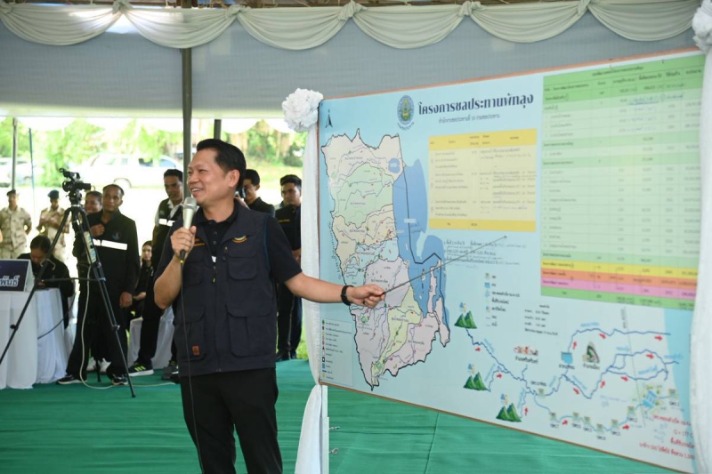 ร้อยเอก ธรรมนัส กล่าวว่า กระทรวงเกษตรและสหกรณ์ให้ความสำคัญกับการบรรเทาความเดือดร้อนของพี่น้องเกษตรกร โดยเฉพาะปัญหาการขาดแคลนน้ำเพื่อการเกษตรในจังหวัดพัทลุง ซึ่งส่งผลกระทบต่อผลผลิต รายได้ และความมั่นคงในอาชีพของเกษตรกร โดยจังหวัดพัทลุงมีปริมาณน้ำฝนสูงกว่า 5,000 ล้านลูกบาศก์เมตร ขณะที่ปัจจุบันมีพื้นที่กักเก็บน้ำได้เพียงประมาณ 140 ล้านลูกบาศก์เมตร ซึ่งถือว่าน้อยมากเมื่อเทียบกับศักยภาพของพื้นที่ จึงต้องเร่งเพิ่มแหล่งน้ำเพื่อบริหารจัดการน้ำเพื่อการเกษตร และป้องกันปัญหาน้ำท่วมอย่างมีประสิทธิภาพ