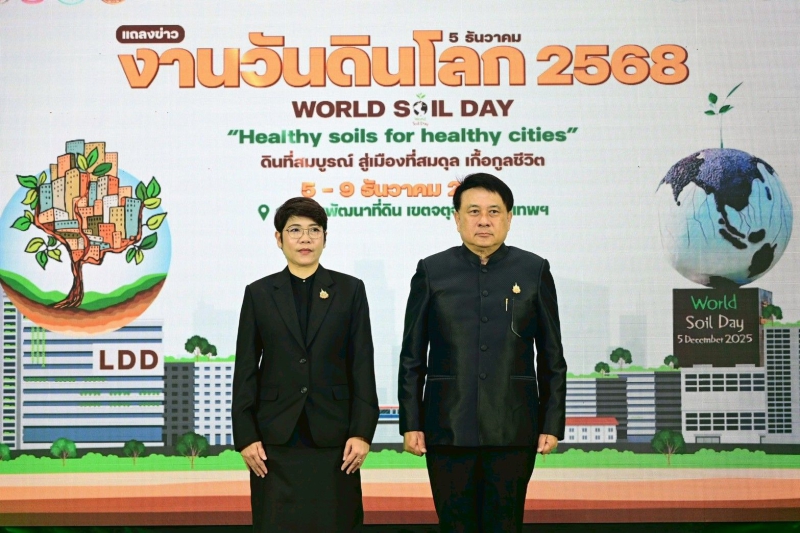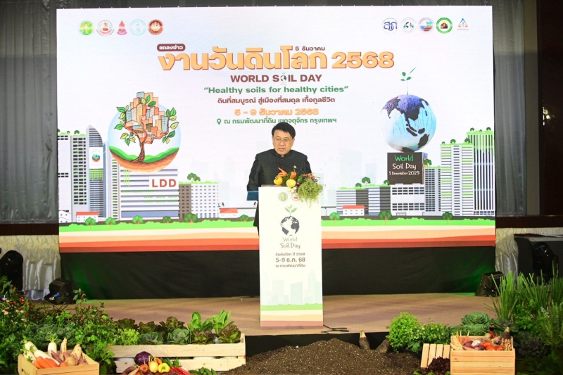 นายนเรศ ธำรงค์ทิพยคุณ รัฐมนตรีช่วยว่าการกระทรวงเกษตรและสหกรณ์ เป็นประธานงานแถลงข่าวเตรียมจัดงาน “วันดินโลก (World Soil Day) ประจำปี 2568” ภายใต้หัวข้อ “Healthy soils for healthy cities – ดินที่สมบูรณ์ สู่เมืองที่สมดุล เกื้อกูลชีวิต” ระหว่างวันที่ 5 – 9 ธันวาคม 2568 เพื่อเทิดพระเกียรติพระบาทสมเด็จพระบรมชนกาธิเบศร มหาภูมิพลอดุลยเดชมหาราช บรมนาถบพิตร พระมหากษัตริย์นักพัฒนา พระผู้ทรงมีพระอัจฉริยภาพ พระมหากรุณาธิคุณด้านการจัดการดินอย่างยั่งยืน พร้อมทั้งเผยแพร่ความรู้และการแลกเปลี่ยนข้อมูลเกี่ยวกับการอนุรักษ์ทรัพยากรดิน เน้นย้ำถึงความสำคัญของดินสุขภาพดีซึ่งเป็นพื้นฐานการพัฒนาเมืองให้น่าอยู่ ที่มีการเติบโตอย่างสมดุล ทั้งด้านเศรษฐกิจ สังคม และสิ่งแวดล้อม ช่วยเพิ่มพื้นที่สีเขียว สร้างอาหารที่ปลอดภัยและยกระดับคุณภาพชีวิตของคนเมือง โดยมี นางสาวสุมิตรา วัฒนา อธิบดีกรมพัฒนาที่ดิน และผู้บริหารในสังกัดกระทรวงเกษตรและสหกรณ์ เข้าร่วม ณ ห้องประชุม 2801 กรมพัฒนาที่ดิน เขตจตุจักร กรุงเทพมหานคร