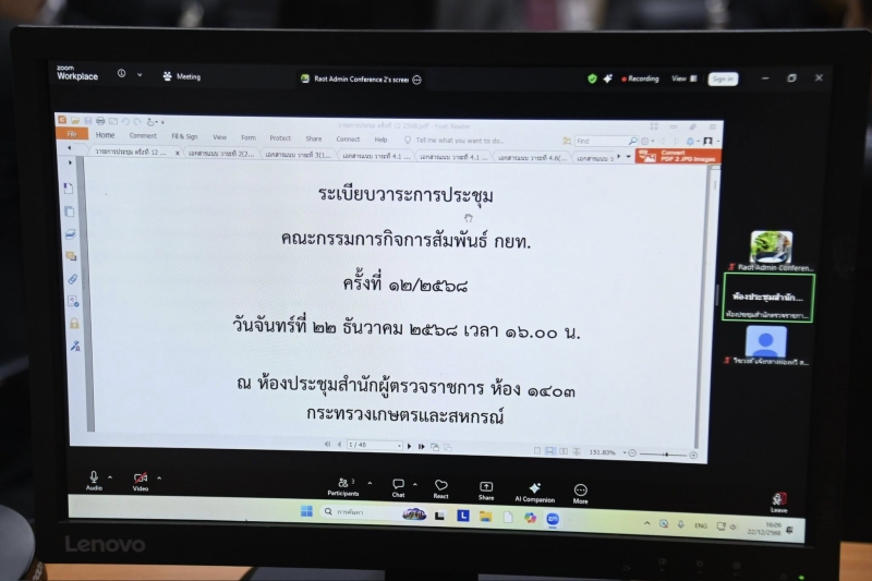 วันที่ 22 ธันวาคม 2568 นายวิณะโรจน์ ทรัพย์ส่งสุข ปลัดกระทรวงเกษตรและสหกรณ์ เป็นประธานการประชุมคณะกรรมการกิจการสัมพันธ์ การยางแห่งประเทศไทย (กยท.) ครั้งที่ 12/2568 ณ ห้องประชุม 1403 กระทรวงเกษตรและสหกรณ์ และผ่านระบบการประชุมออนไลน์ (Zoom Meeting) เพื่อติดตามผลการดำเนินงานตามมติคณะกรรมการกิจการสัมพันธ์ รวมถึงหารือแนวทางการบริหารและพัฒนาบุคลากร เพื่อให้การดำเนินงานของการยางแห่งประเทศไทยเป็นไปอย่างมีประสิทธิภาพและเกิดประโยชน์แก่เกษตรกร