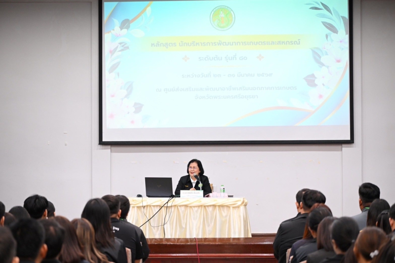 วันที่ 25 มีนาคม 2569 นางสาวทัศนีย์ เมืองแก้ว รองปลัดกระทรวงเกษตรและสหกรณ์ เป็นประธานพิธีเปิดการอบรมหลักสูตรนักบริหารการพัฒนาการเกษตรและสหกรณ์ ระดับต้น (นบต.) รุ่นที่ 80 และบรรยายพิเศษ เรื่อง “นโยบายกระทรวงเกษตรและสหกรณ์” โดยมีนายยุทธภูมิ ประสมทรัพย์ หัวหน้ากลุ่มวิชาการและหลักสูตร สถาบันเกษตราธิการ กล่าวรายงาน และผู้เข้ารับการอบรมจากหน่วยงานในสังกัดกระทรวงเกษตรและสหกรณ์เข้าร่วม จำนวน 100 คน ณ หอประชุมหม่อมราชวงศ์หญิงรสลิน คัคณางค์ ศูนย์ส่งเสริมและพัฒนาอาชีพเสริมนอกภาคการเกษตร บางไทร สำนักงานการปฏิรูปที่ดินเพื่อเกษตรกรรม (ส.ป.ก.) ต.ช้างใหญ่ อ.บางไทร จ.พระนครศรีอยุธยา