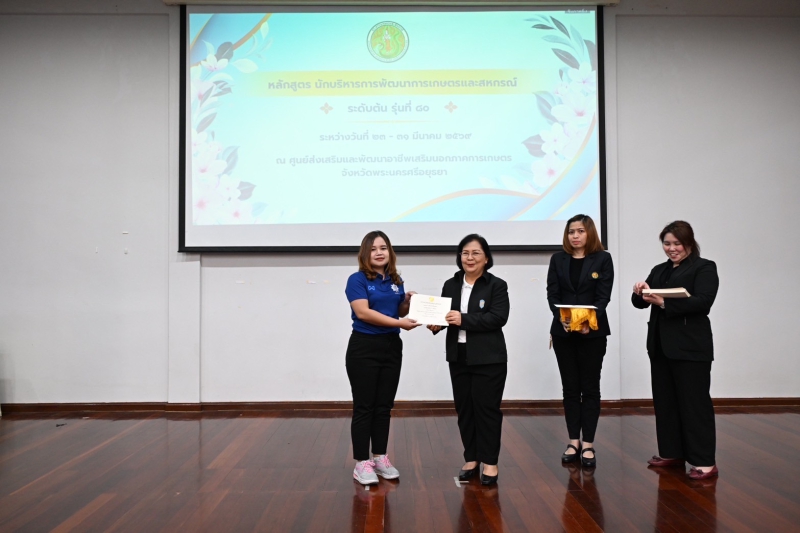 วันที่ 31 มีนาคม 2569 นางสาวทัศนีย์ เมืองแก้ว รองปลัดกระทรวงเกษตรและสหกรณ์ เป็นประธานพิธีปิดและมอบประกาศนียบัตรแก่ผู้ผ่านการฝึกอบรมหลักสูตร นักบริหารการพัฒนาการเกษตรและสหกรณ์ ระดับต้น (นบต.) รุ่นที่ 80 โดยมีนางวรรณ์ภัสสร ศรีจันทร์ ผู้อำนวยการสถาบันเกษตราธิการ เป็นผู้กล่าวรายงาน พร้อมด้วยผู้เข้าอบรมจากหน่วยงานในสังกัดกระทรวงเกษตรและสหกรณ์ จำนวน 100 คน และเจ้าหน้าที่ที่มีส่วนเกี่ยวข้องเข้าร่วม ณ หอประชุมหม่อมราชวงศ์หญิงรสลิน คัคณางค์ ศูนย์ส่งเสริมและพัฒนาอาชีพเสริมนอกภาคการเกษตร บางไทร สำนักงานการปฏิรูปที่ดินเพื่อเกษตรกรรม (ส.ป.ก.) ต.ช้างใหญ่ อ.บางไทร จ.พระนครศรีอยุธยา