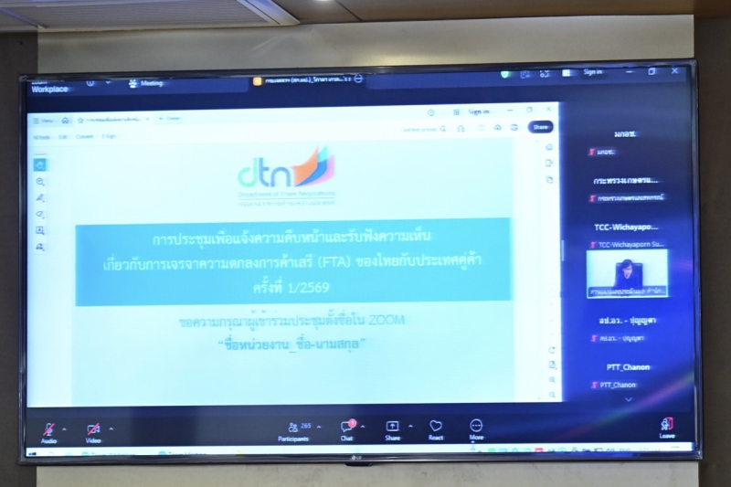 นางสาวนฤมล สงวนวงศ์ รองปลัดกระทรวงเกษตรและสหกรณ์ พร้อมด้วยผู้แทนจากหน่วยงานในสังกัดกระทรวงเกษตรและสหกรณ์ เข้าร่วมประชุมรับฟังความคืบหน้าและรับฟังความเห็นเกี่ยวกับการเจรจาความตกลงการค้าเสรี (FTA) ระหว่างไทยกับประเทศคู่ค้า ครั้งที่ 1/2569 โดยมีอธิบดีกรมเจรจาการค้าระหว่างประเทศ เป็นประธาน ผ่านระบบออนไลน์ (Zoom Meeting) ซึ่งที่ประชุมได้รับทราบความคืบหน้าและร่วมให้ข้อคิดเห็นเกี่ยวกับการเจรจา FTA ในกรอบต่าง ๆ ได้แก่ การจัดทำความตกลงระหว่าง ไทย-สหภาพยุโรป (EU), ไทย-เปรู, อาเซียน-แคนาดา อาเซียน-อินเดีย และการเจรจาความตกลงเศรษฐกิจดิจิทัลอาเซียน (DEFA) ซึ่งจะเป็นกลไกสำคัญในการขยายโอกาสการส่งออกสินค้าเกษตรไทยสู่ตลาดโลกมากยิ่งขึ้น ขณะเดียวกัน ไทยจะยังคงมุ่งมั่นที่จะรักษาผลประโยชน์และคุ้มครองเกษตรกรในประเทศ โดยเน้นการเจรจาบนพื้นฐานของความสมดุลที่สอดคล้องกับบริบทของประเทศ เพื่อลดผลกระทบต่อเกษตรกรให้ได้มากที่สุดอีกด้วย