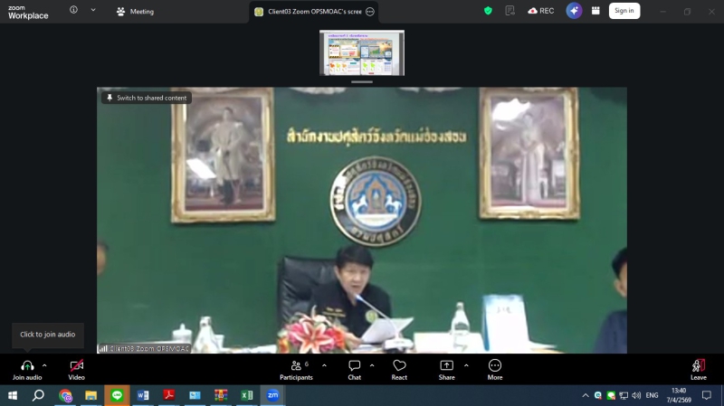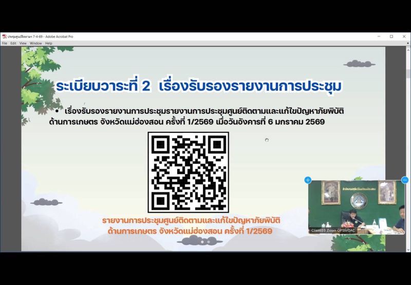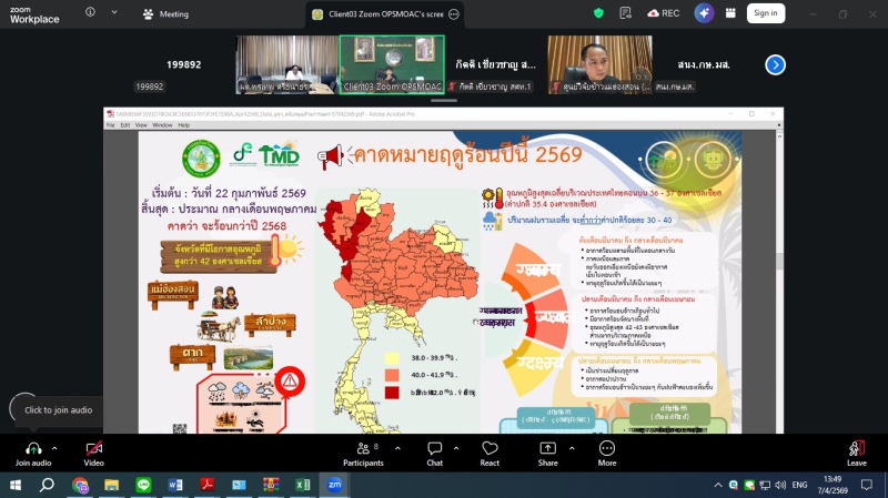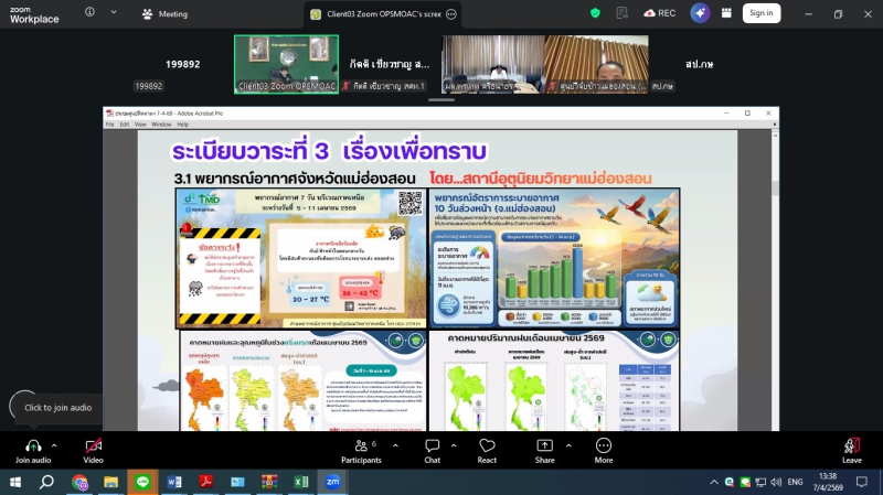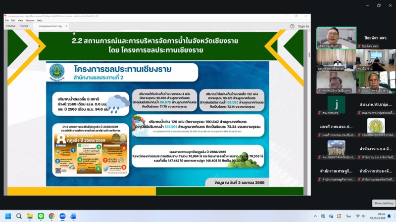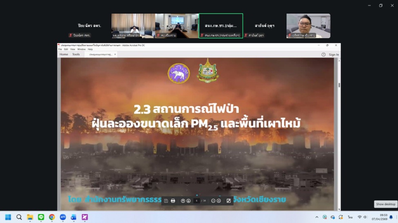 วันอังคารที่ 7 เมษายน 2569 ดร.พรเทพ ศรีธนาธร ผู้ตรวจราชการกระทรวงเกษตรและสหกรณ์ เขตตรวจราชการที่ 15 และ 16 เป็นประธานการประชุมติดตามการดำเนินงานของศูนย์ติดตามและแก้ไขปัญหาภัยพิบัติด้านการเกษตรในพื้นที่จังหวัดเชียงรายและแม่ฮ่องสอน เพื่อขับเคลื่อนมาตรการป้องกันไฟป่า หมอกควัน และการบริหารจัดการน้ำ ผ่านระบบออนไลน์ Zoom meeting ณ ห้องประชุมสำนักตรวจราชการ โดยในช่วงเช้า เวลา 09.30 น. เป็นประธานการประชุมฯ ศูนย์ติดตามฯจังหวัดเชียงราย ในประเด็นไฟป่า จุดความร้อน (Hotspot) ในพื้นที่ป่าและเกษตร โดยกำชับให้หน่วยงานเฝ้าระวังและบูณาการการทำงานร่วมกัน รวมถึงการจัดการน้ำ อ่างเก็บน้ำ ในเขตชลประทาน ให้มีประสิทธิภาพสูงสุดเพื่อป้องกันผลผลิตเสียหายในช่วงฤดูแล้ง