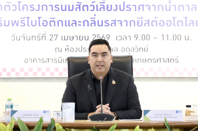 นายวัชระพล ขาวขำ รัฐมนตรีช่วยว่าการกระทรวงเกษตรและสหกรณ์ ให้เกียรติเข้าร่วมงานแถลงข่าวเปิดตัวโครงการโครงการนมสัตว์เลี้ยงปราศจากน้ำตาลแลคโตส เสริมพรีไบโอติก และกลิ่นรสจากยีสต์ออโตไลเสท (KU Lactova Milk) ซึ่งเป็นนวัตกรรมนมสำหรับสัตว์เลี้ยงปราศจากน้ำตาลแลคโตส 100% ผลงานวิจัยและพัฒนาจากศูนย์ผลิตภัณฑ์นม มหาวิทยาลัยเกษตรศาสตร์ โดยมี ดร.ดำรงค์ ศรีพระราม รักษาการแทนอธิการบดี มหาวิทยาลัยเกษตรศาสตร์ เป็นประธาน ณ ห้องประชุมกำพล อดุลวิทย์ อาคารสารนิเทศ 50 ปี มหาวิทยาลัยเกษตรศาสตร์ บางเขน กรุงเทพฯ